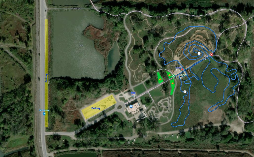 Staging is in the northeast corner nearest the North Parking lot access road. The finish line and registration are to the south of staging. The two-way pit is just east of the aquatic center. The course has 10-inch-high double barriers in the first half-mile. After dipping around the pool, a short stretch of pavement leads to higher ground.